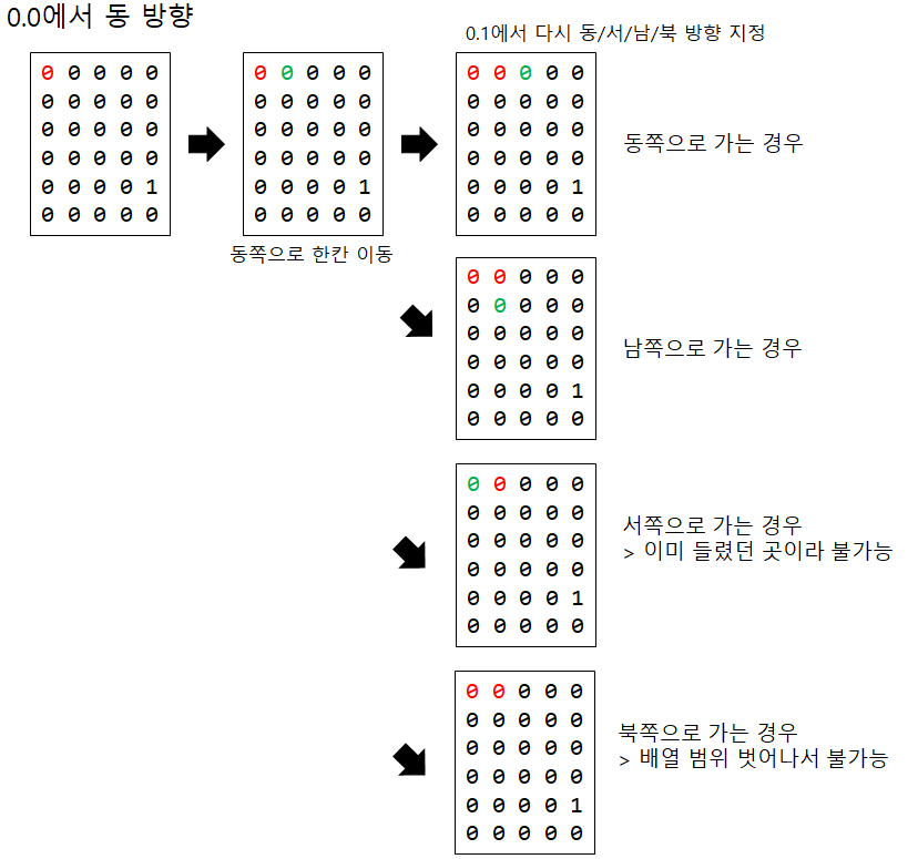 0.0에서 총 4번의 경우의 수를 도는데, 동쪽으로 가서 0.1로 가게 된다면 0.1에서 또다시 동/서/남/북 방향으로 한칸씩 이동해본다. 모든 경우의 수를 보는 것