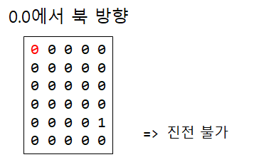 0.0에서 북방향으로 이동하면 배열의 범위를 벗어나므로 끝난다. 다른 방향을 계속해서 보기위하여 continue; 사용