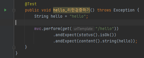 .andExpect(content().string(hello)) - MockMvc 객체의 결과 검증: 응답 본문 내용 검증 ( hello가 return 됐는지 비교 )
