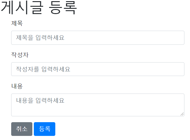 취소버튼은 누르면 "/"경로인 메인 index로 이동하게 되어있지만 등록버튼은 눌렀을때 반응이 없을 것이다.