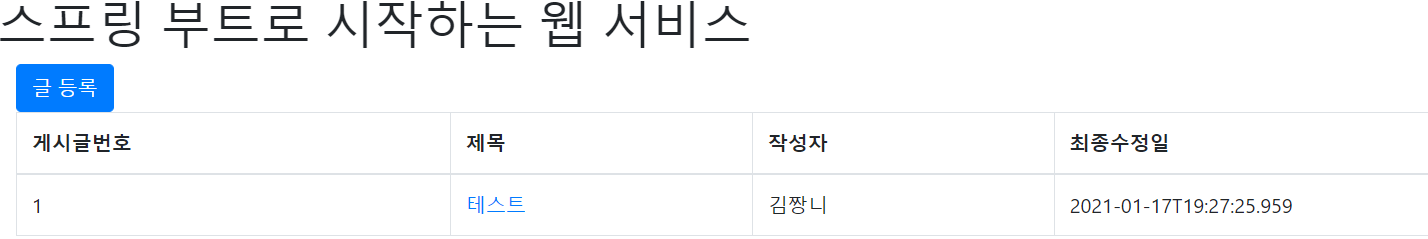 프로젝트를 다시 run()한 후, 게시물 등록한뒤 메인index 페이지로가면 이렇게 목록이 보인다.
