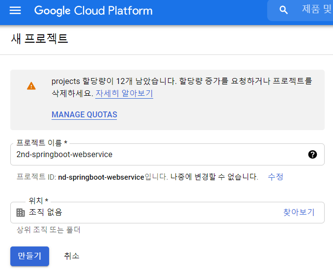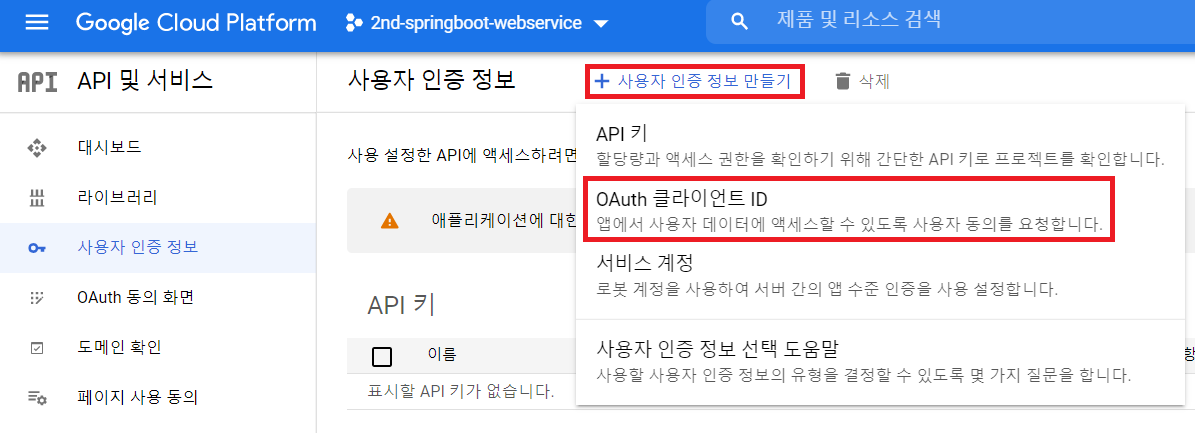 2. API 및 서비스 - 사용자 인증 정보 - 프로젝트 생성 후 인증정보 만들기