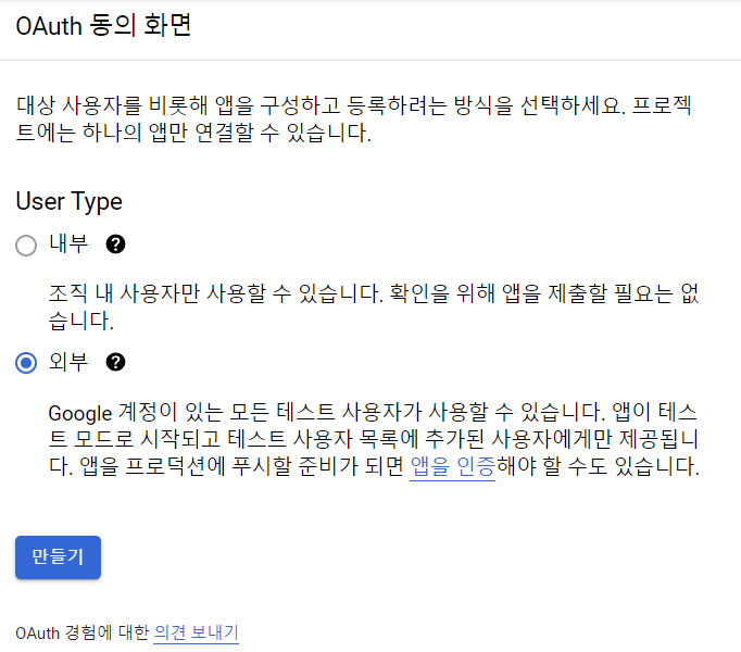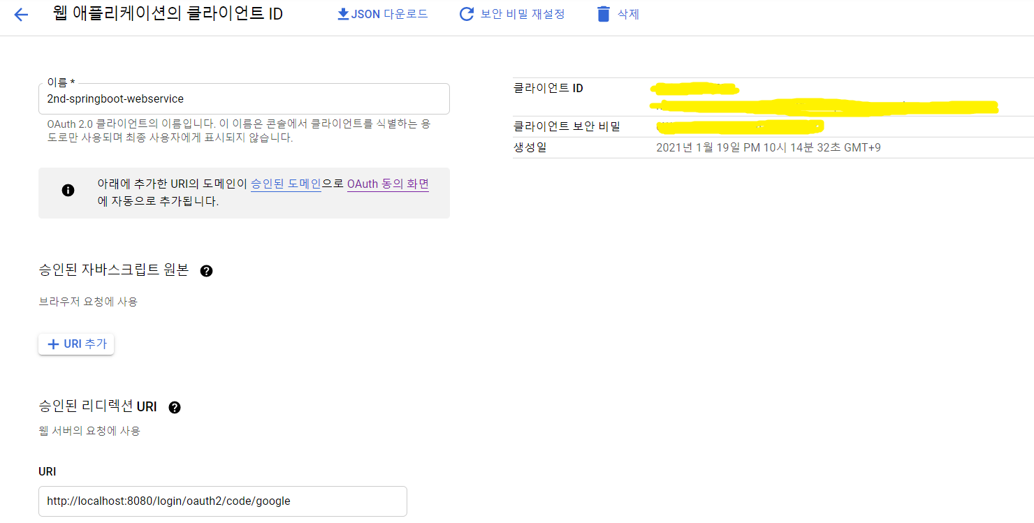 구성이 끝나면 다시 [사용자 인증정보] 탭에 들어가서 다시 OAuth클라이언트 ID 만들기를 시도하여