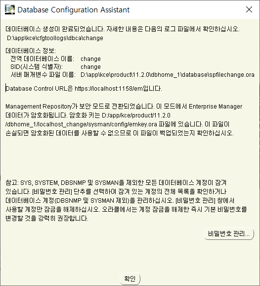 관리 비밀번호는 System 계정의 비번으로 보면 된다.