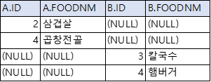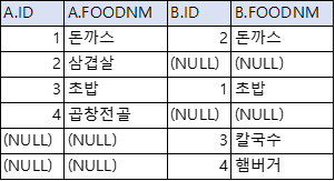 FOOD_A에만 있는데이터, FOOD_B에만 있는데이터, FOOD_A/B 모두 있는 데이터가 다 추출이 된다.