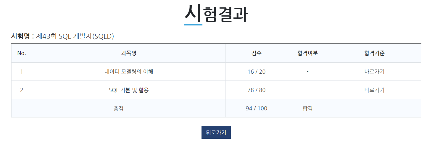 SQLD는 총 2개의 과목으로 이루어져있으며, 합격 기준은 100점 만점에 60점 이상이여야한다.