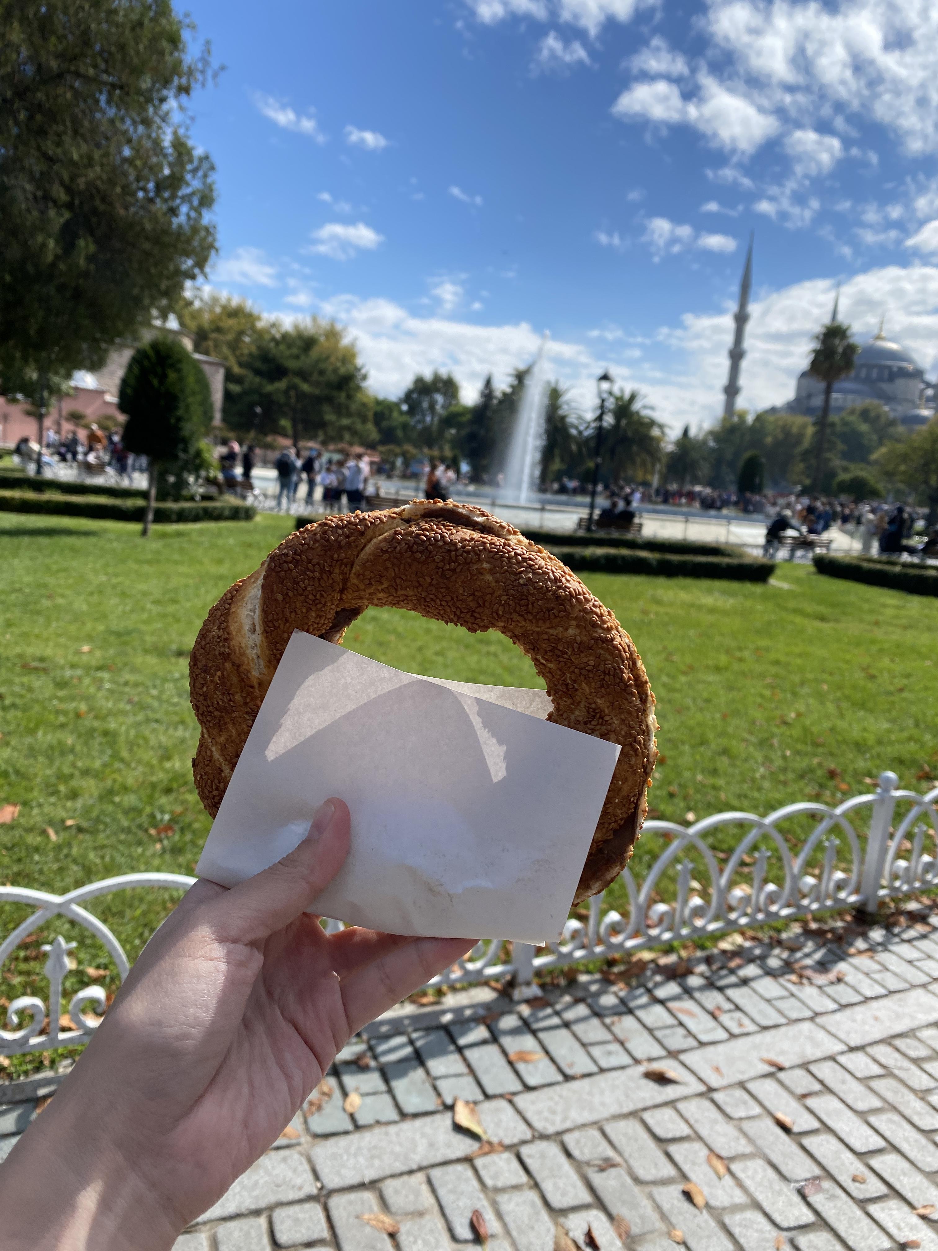 두개의 모스크를 다 보고나서 공원에 앉아서 시미트를 먹었다.