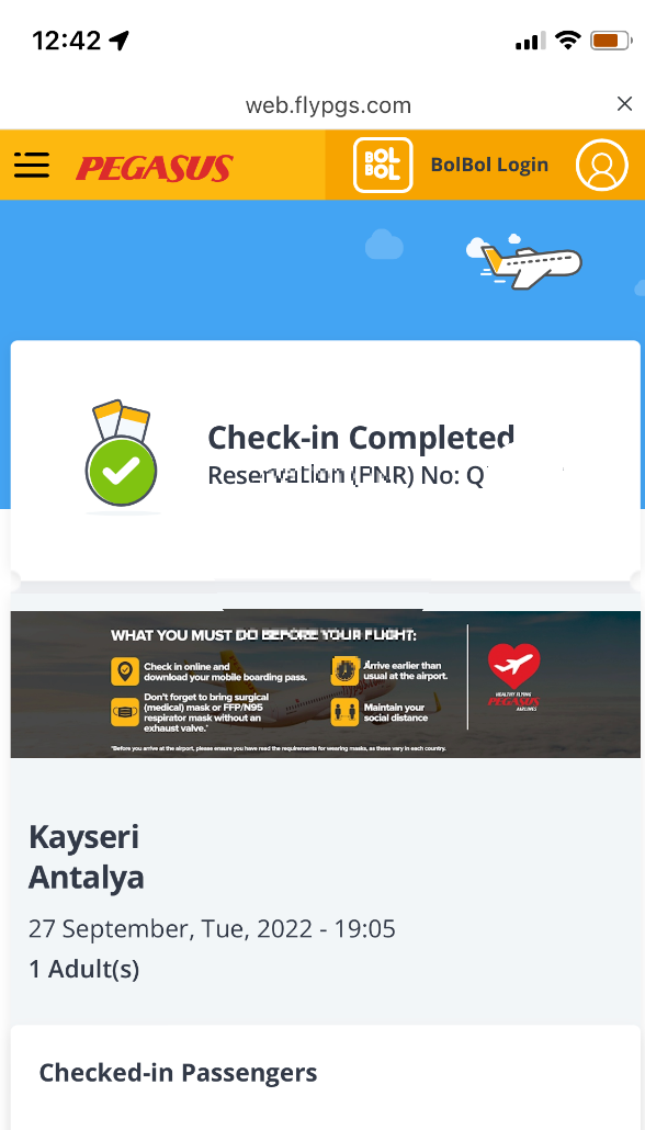 이건 카이세리->안탈리아로 가는 국내선 비행기인데.. 탑승 7일인가 5일전부터 온라인 체크인이 가능하다.