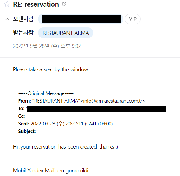 예약하고 나면 기재한 메일로 확인 메일이 날라오는데, 한번 더 창가쪽으로 안내해달라고 요청을 했다.