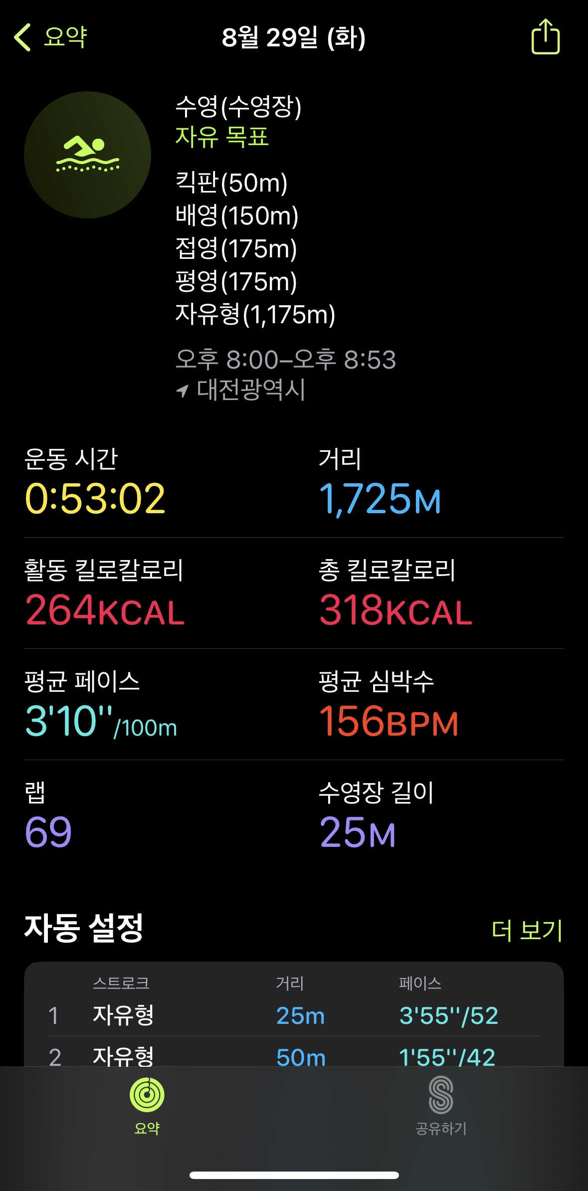 마지막으로는... 최근에 했던 수영기록 놓고간다.
