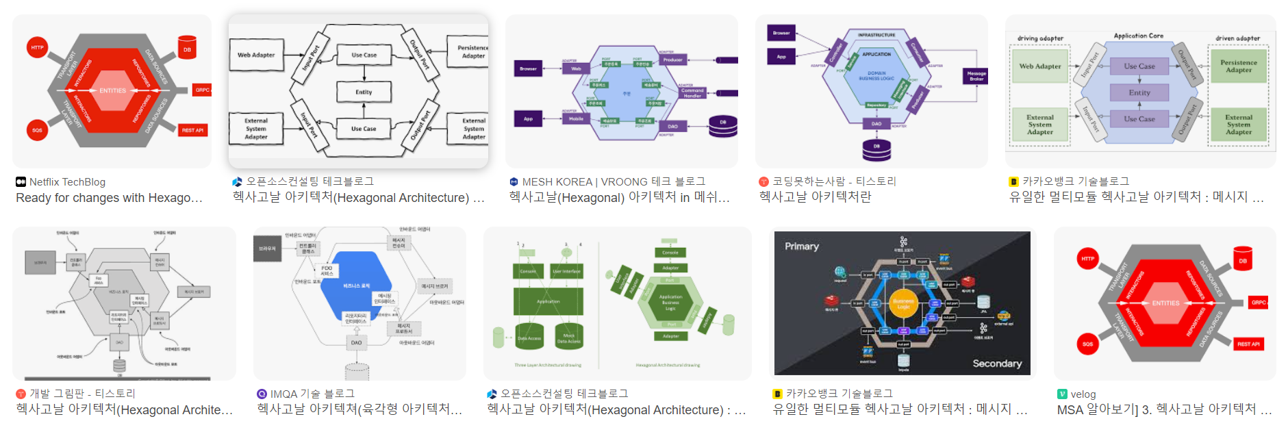 - 어댑터(Adapters): 외부 시스템(예: 데이터베이스, 사용자 인터페이스, 외부 서비스)과의 직접적인 구현과 상호작용을 처리하는 어댑터를 사용합니다.