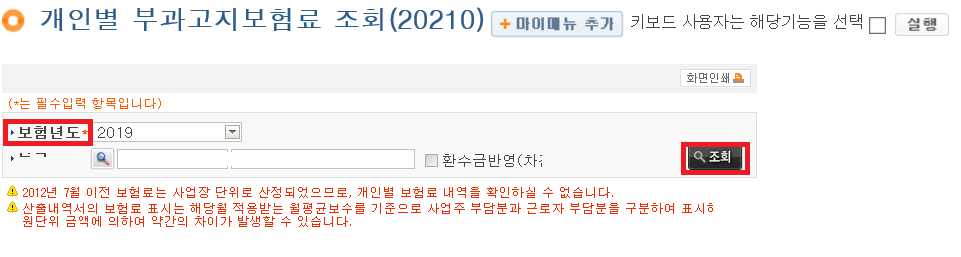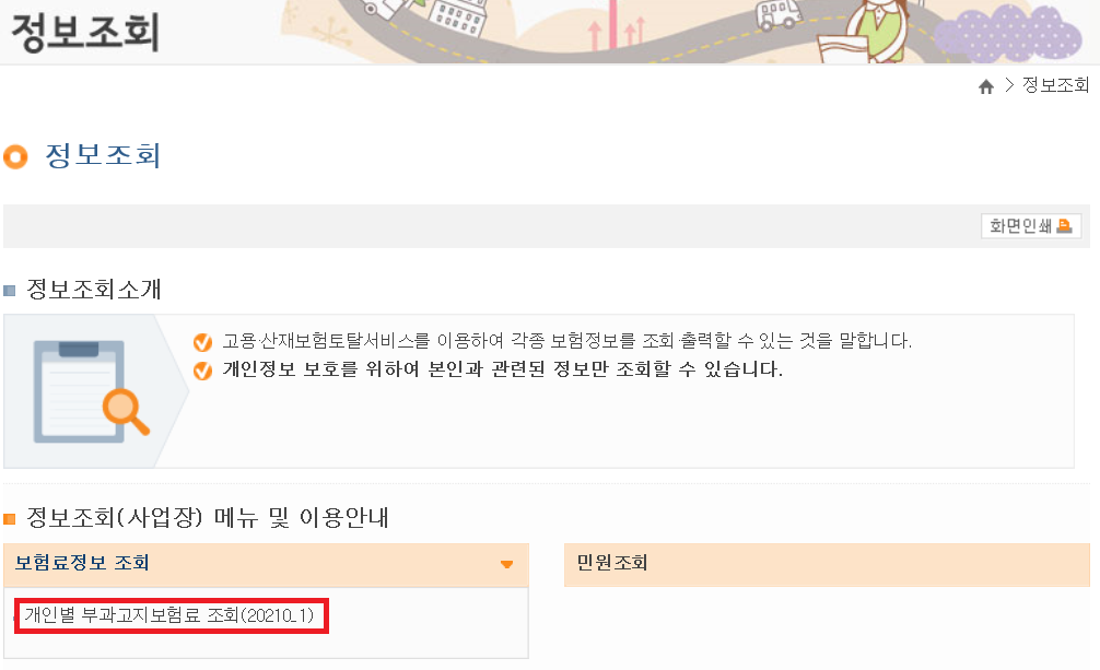 4. 보험료정보 조회- 개인별 부과고지보험료 조회 클릭