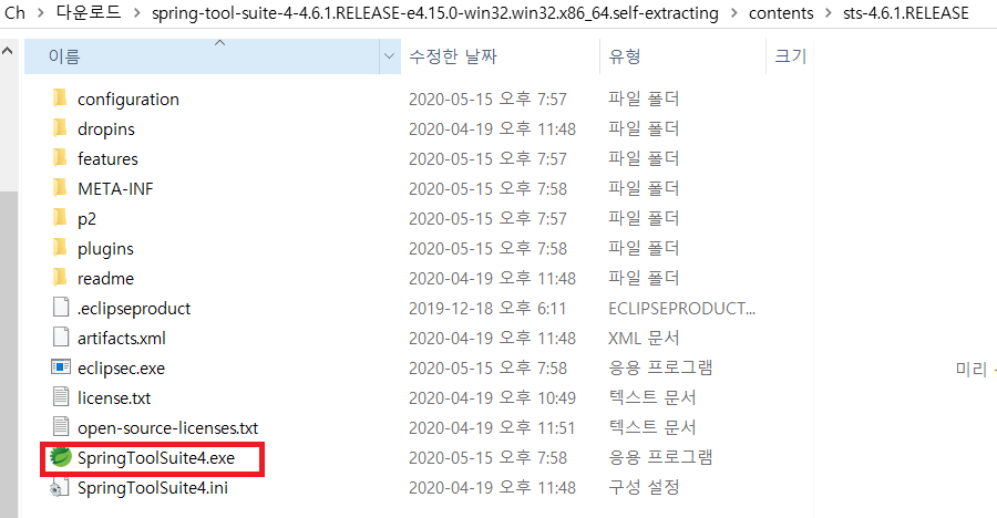 sts-4.6.1.RELEASE 로 들어가서 SpringToolSuite4.exe 를 실행한다.