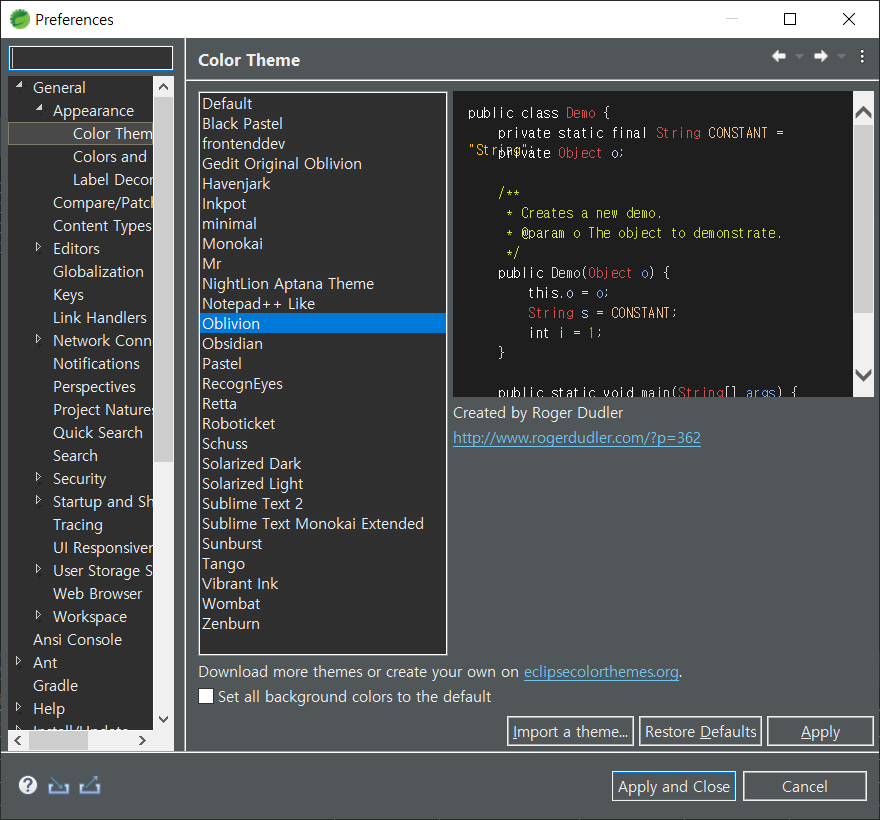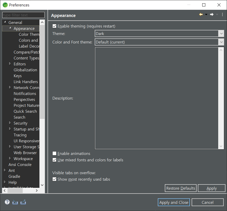 5. Window -Preferences - General - Apperance 에서 theme를 dark로 변경