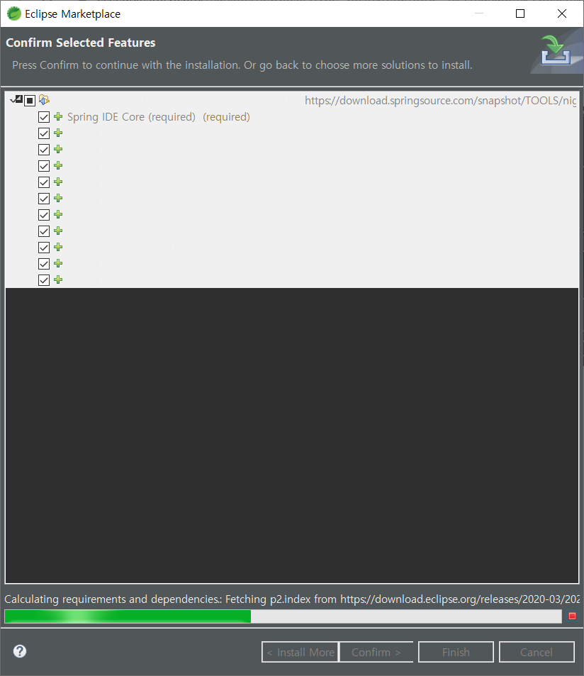 설치가 다되고 Finish를 누르면 STS의 화면 우측하단에 이렇게 설치중이라고 나온다. 설치가 다되면 restart를 진행한다.