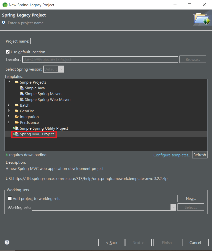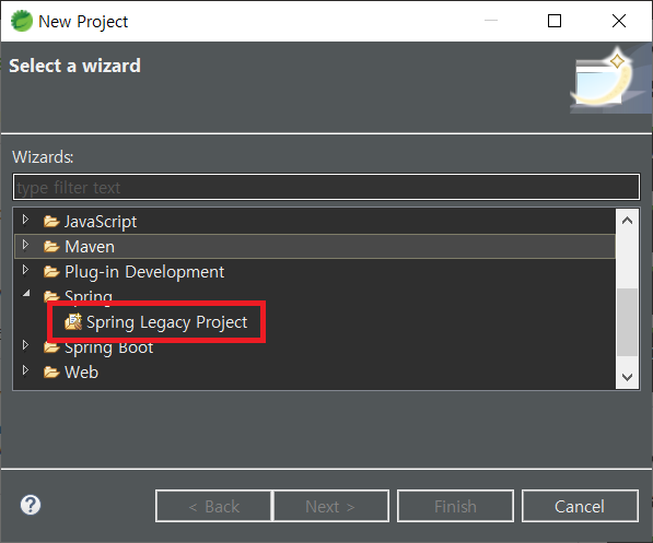 File - New - Project.. 에서 Spring Legacy Project를 선택 후, Spring MVC Project를 선택한다.
