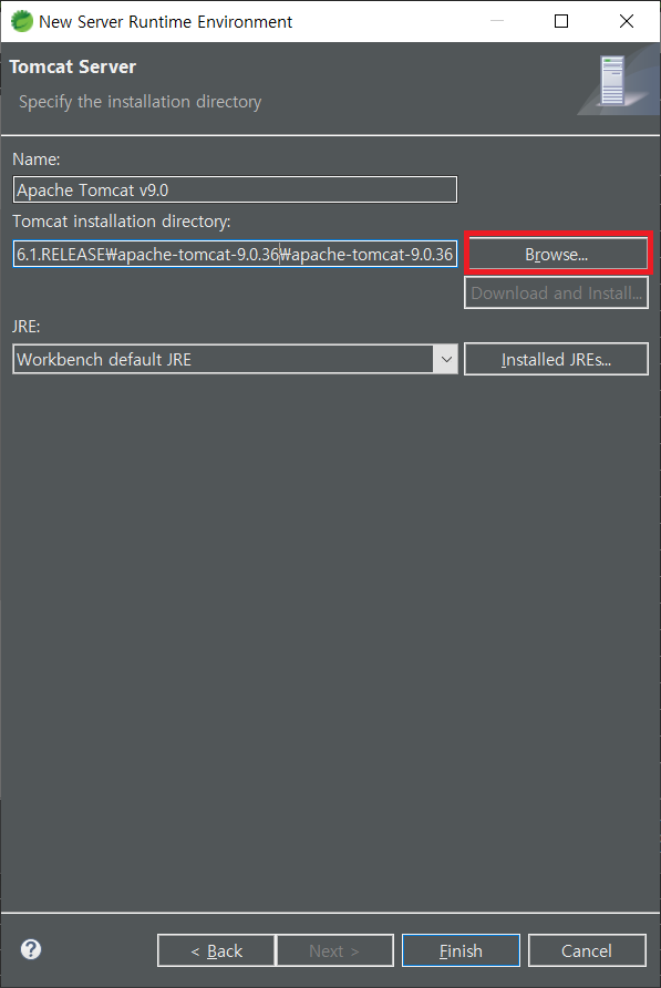 Apache 폴더에서 아까 다운받았던 버전의 서버를 클릭하고 Next, 한다. 그다음 Browse.. 를 눌러 톰캣이 설치된 폴더의 경로를 선택한다.