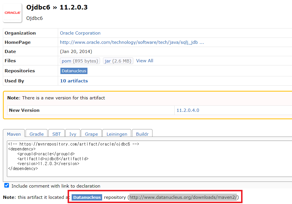 (https://mvnrepository.com/artifact/oracle/ojdbc6/11.2.0.3) .. 주기적으로 자주 바뀌는듯..?