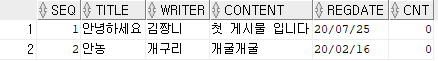 INSERT INTO BOARD(SEQ,TITLE,WRITER,CONTENT,REGDATE,CNT) VALUES (SEQ_BOARD.NEXTVAL,'안농','개구리','개굴개굴','2020-02-16',0);