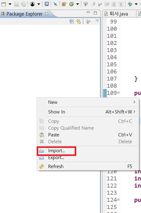 2. ecplise의 [Package Explorer]에서 우클릭하여 [Import...] 클릭