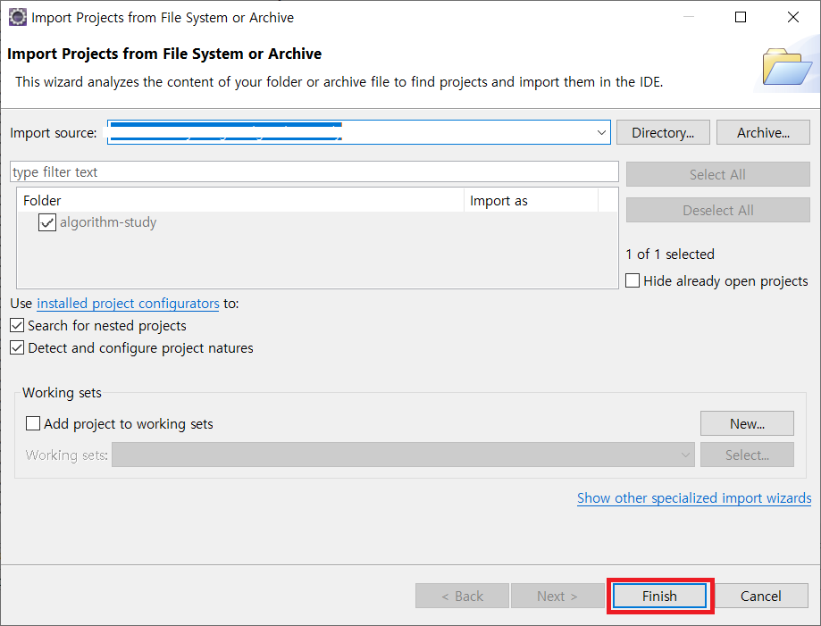 10. Import할 프로젝트의 위치 확인 후 Finish.