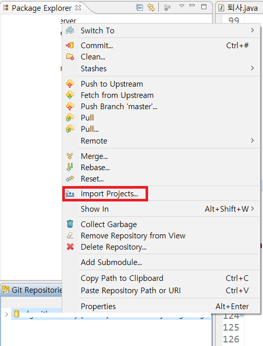 9. 해당 repo. 우클릭 하여 [Import Projects...] 클릭